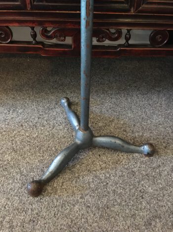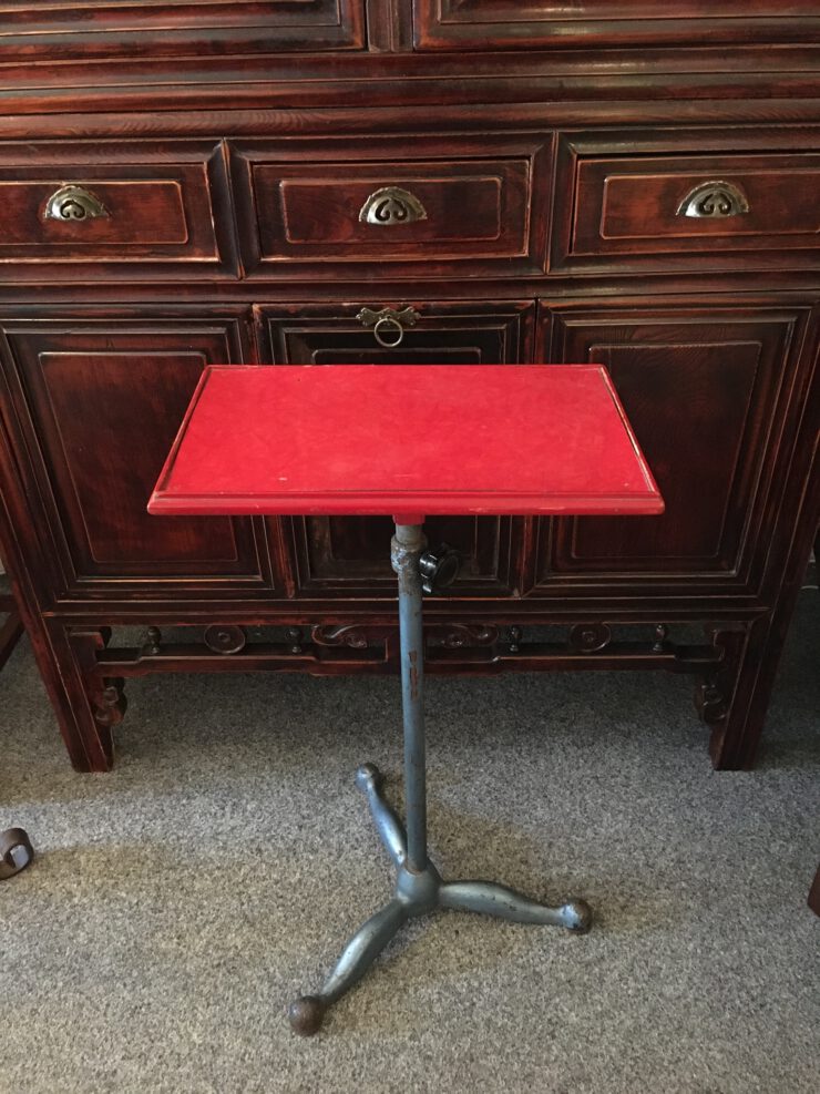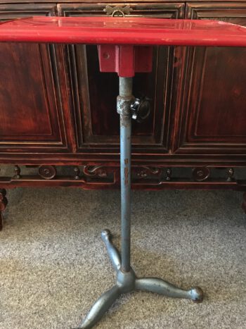 Vintage atelier tafeltje op zware poot. Tafel is verstelbaar. Rood formica blad. In vintage staat.