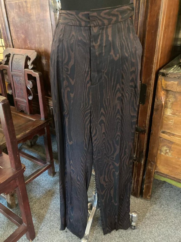 Viscose / Katoenen broek van het merk H&M studio collection. Dierprint bruin/zwart. Bandplooi, 2 steekzakken en 1 paspel achterzak.