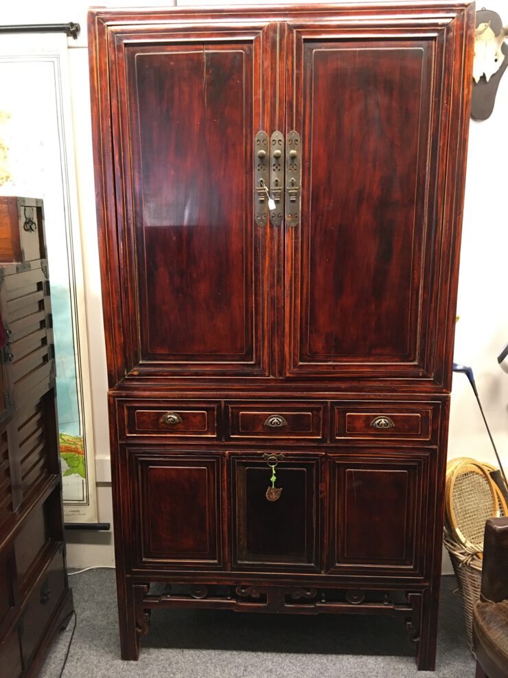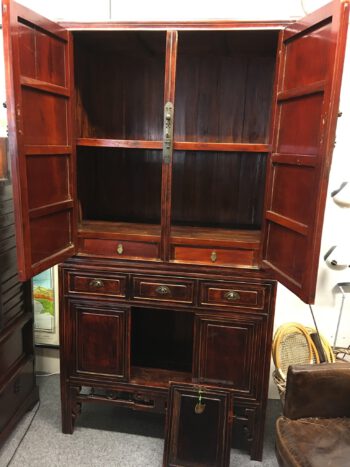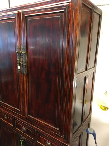 Een grote Chines kast, prachtig donkerrood hout. Mooi beslag. De kast verkeert in uitstekende conditie.