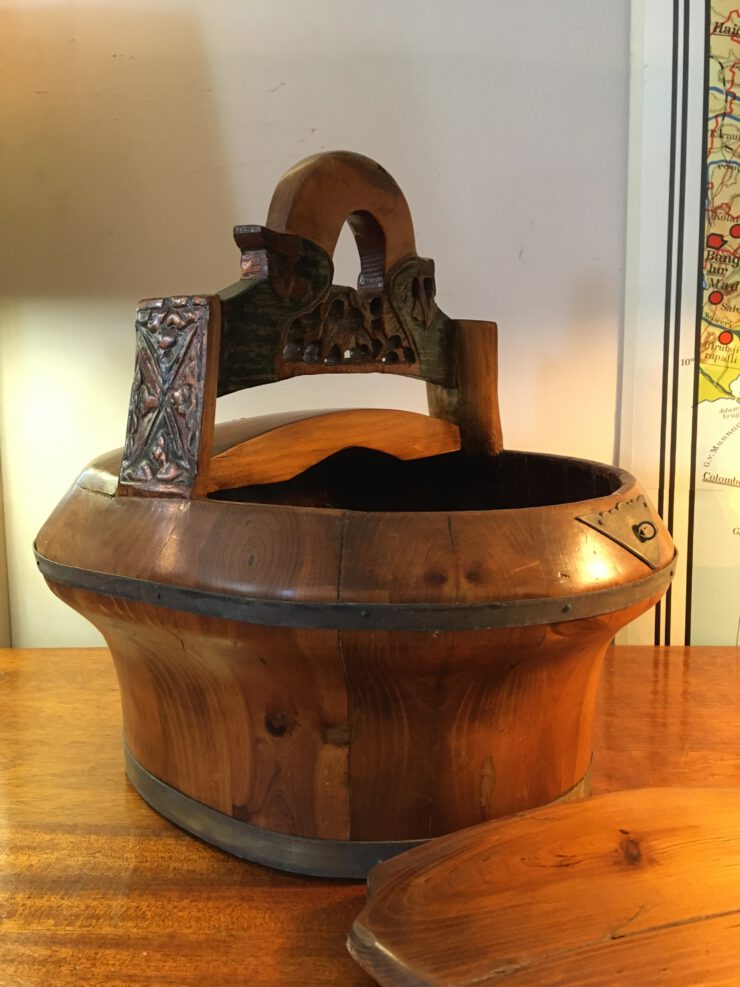 Een oude houten mand of bak die in China werd gebruikt om rijst of ander voedsel te bewaren en transporteren