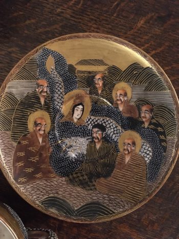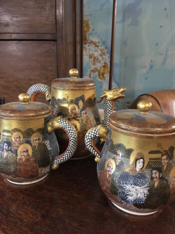 Japanse Meiji periode Satsuma handgeschilderde theeset van Omura (fabrikant) versierd met Kannon en Rakan en rondom een witte draak. Het geheel is handgeschilderd in goud/zwart/wit. Zeer dun en delicaat. In zeer mooie staat.