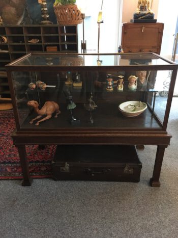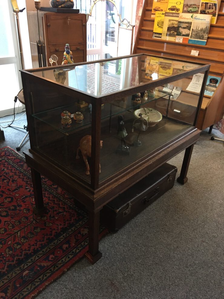 Museum vitrinekast in zeer fraaie antieke staat. Achterzijde heeft een deur. De vitrine staat op een onderkast op poten en bevat 1 glazen legger op messing houders.