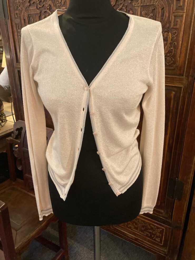 Vintage Dun Lurex vestje met lange mouwen van het merk Tramontana, sluiting met parelknoopjes. Champagnekleurig.