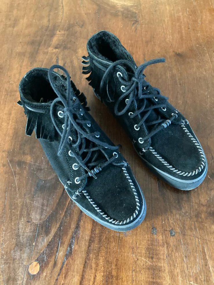 Een paar suede Ugg Australia moccasins met franje. Bont gevoerd.