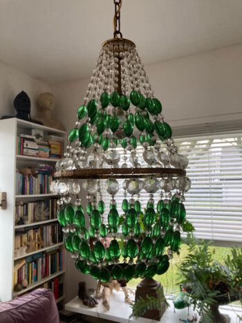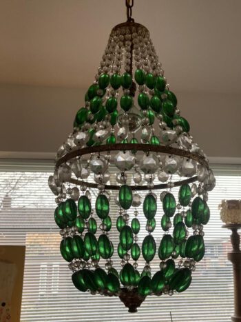 Een antieke zakkroonluchter met groen en helder glas. In mooie staat. De lamp heeft één lichtpunt.